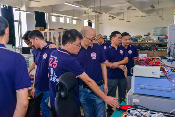 随后,校友们信步至焕然一新的电气工程与自动化学院楼。明亮的院史长廊如同时光隧道,串联起学院的过去与现在。在展示学院近年来学科建设成就的展板前,校友们频频点头赞许;在呈现先进实验设备和科研平台的影像前,大家热烈交流讨论。当年的教室虽已旧貌换新颜,但黑板上仿佛还留存着微分方程的演算,实验室里似乎还回荡着仪器运转的声响。在学院楼前,伴随着清脆的快门声,校友们的笑脸与秋日暖阳一同定格,将这份历久弥新的同窗情谊永远珍藏。