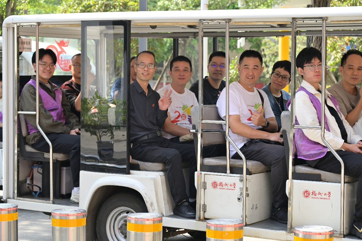 参观结束后,校友搭乘电瓶车游览旗山校区,途经图书馆、运动场馆、教学实验区及学生生活区,校友们一边聆听志愿者的校园景观介绍,一边畅谈往事、对比今昔,对母校办学条件的飞速提升和育人环境的日臻完善赞叹不已。