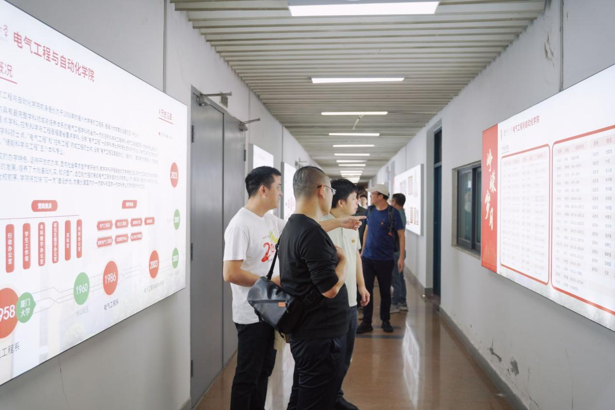 随后,校友们移步至电气学院,参观了院史长廊与办公楼。在院史展区,校友们驻足良久,在熟悉的师长照片前回忆往昔,在学科竞赛获奖名单前寻找后辈身影,在科研成果展示区频频点头赞许。当年的教室、实验室虽已焕然一新,但“电气人”的实干精神与学术追求始终传承。校友们为母院日新月异的变化与发展成就深感自豪,青春记忆与学院成果在此刻交织,不禁感慨万千。在学院楼内,校友们再次合影,将这份对母院的深情与祝福定格于镜头之中。