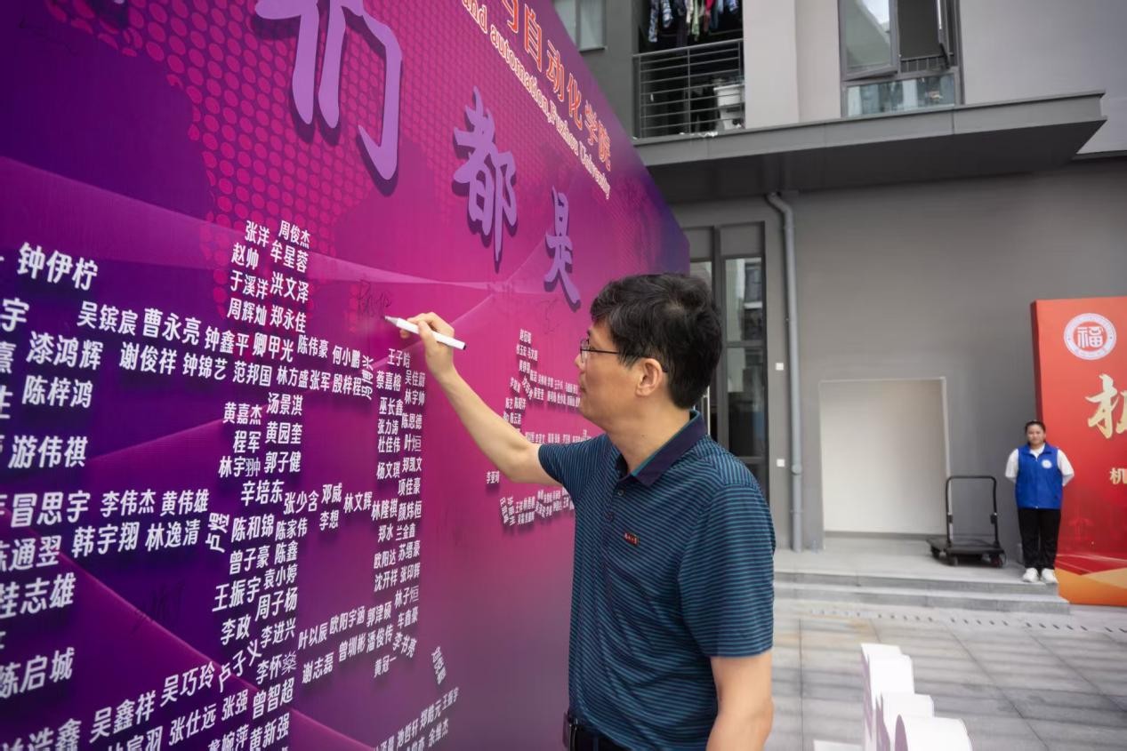 展板前,新生与家长们纷纷停下脚步,寻找属于自己的“电气印记”,挥笔签名,写下对大学生活的期待与向往,一同定格合影,留下珍贵的初见记忆。