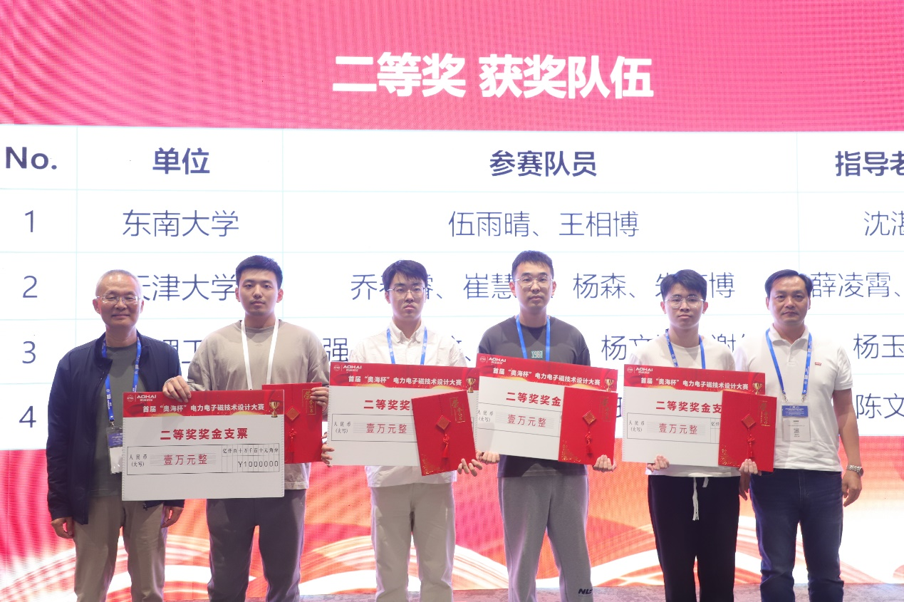 中国电源学会磁技术专委会荣誉主任委员福州大学陈为教授和奥海科技国内电子研发游碧锋总经理给二等奖获奖队伍颁奖。