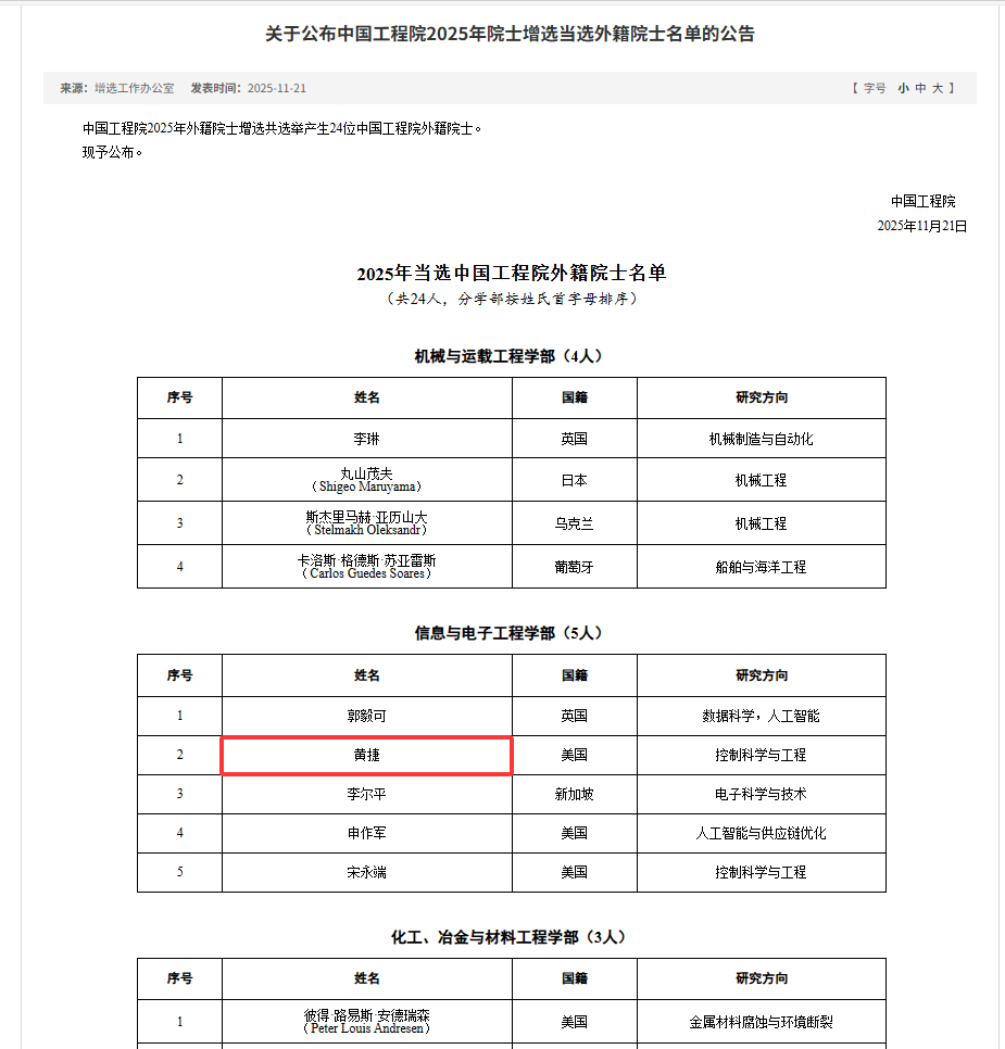 黄捷教授获选IFAC院士