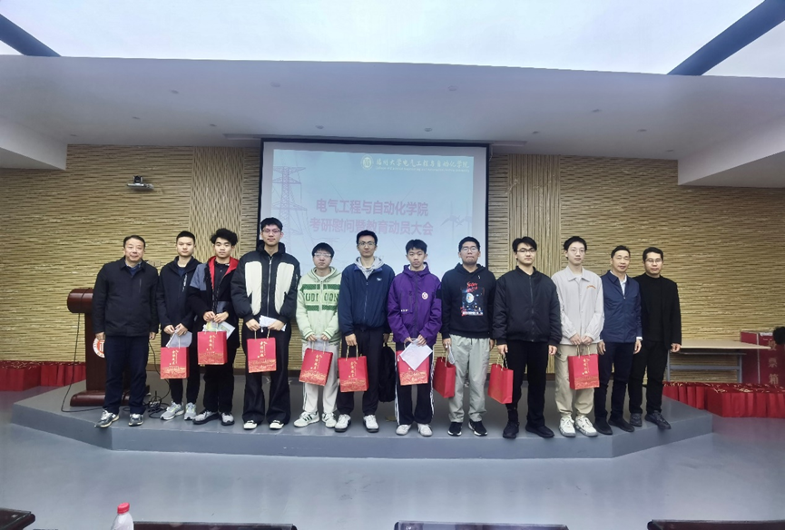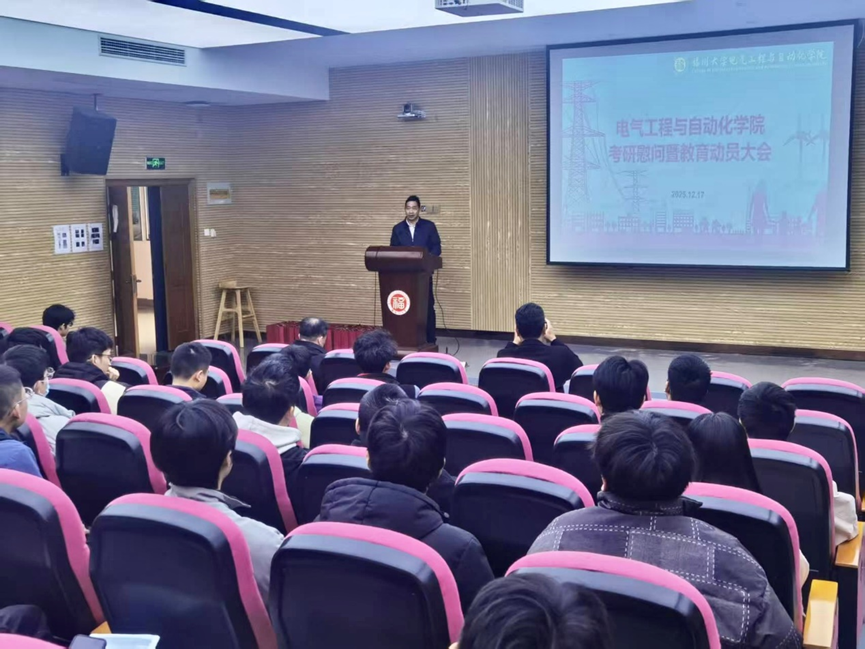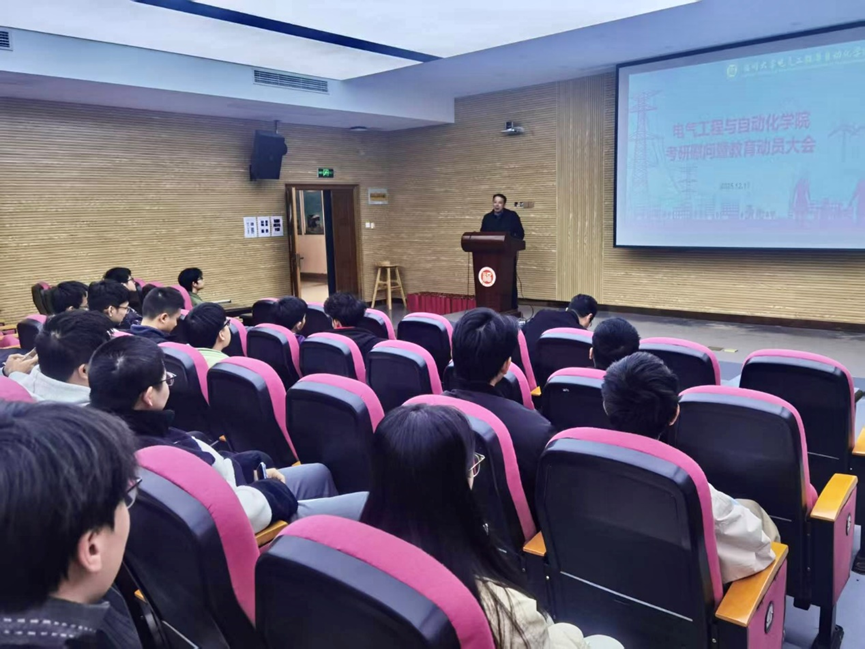 近日,随着2026年全国硕士研究生统一招生考试日渐临近,电气工程与自动化学院在电气学院新楚楼北230召开了考研慰问暨教育动员大会。此次大会意在鼓舞即将奔赴考场的2026届考研学子,为他们送上真挚关怀与坚定支持,助力学子们以最理想的应考状态迎接这场重要的人生考验。院党委书记潘志辉老师、院党委副书记杜领军老师、副院长王武教授、毕业班辅导员尹万东老师以及2022级考研学子共同出席了本次大会。
