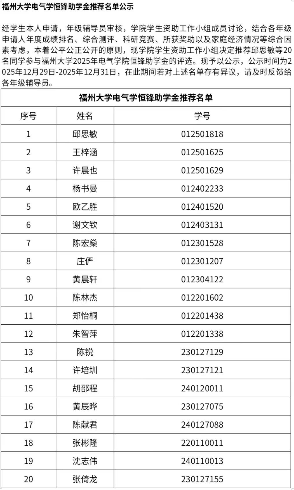 福州大学电气学恒锋助学金推荐名单公示