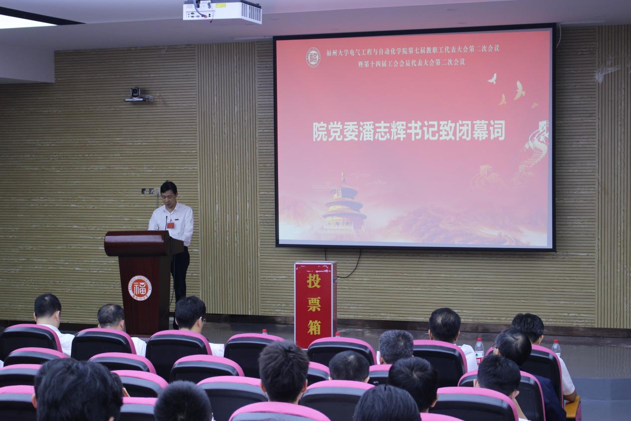 闭幕式上,院党委书记潘志辉致辞。他指出,本次大会是一次总结过去、凝聚共识、展望未来的动员大会,也是一次共商大计、共担使命、共绘蓝图的工作大会,对推动学院新阶段实现新跃升具有重要意义。潘志辉书记就加快推进“一流”学院建设、实现高质量发展提出三点意见:一是提高站位,统一思想,认真编制好学院“十五五”发展规划纲要,把学院工作摆到全国一流坐标体系中去衡量;二是作风优良,务求实效,解决学科、人才等瓶颈问题,出实招、务实功、求实效,真正想方设法解决实际问题,拒绝“躺平”,积极主动谋划学院发展;三是整合资源,形成合力,全院上下要整合校内校外、院内院外的资源,树立电气学院“主人翁”意识,自觉把自己放在学院发展大局下去思考问题,自觉做学院发展的拥护者、宣传者、践行者、推动者。潘志辉书记号召全院以时不我待的紧迫感,舍我其谁的责任感,围绕学院“一号工程”和学校“八大重点任务”,加速推进国内外一流学科和国家一流本科专业建设,促进人才的培养水平和速度,让学子们成为社会发展的动力源和加速器。