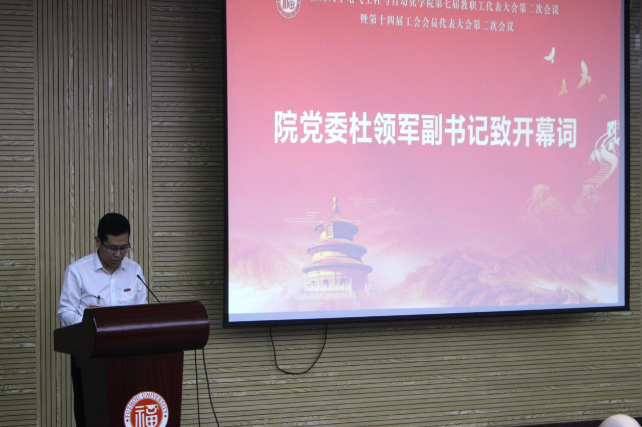 院党委副书记杜领军致开幕词。正值“十四五”规划收官和“十五五”规划谋篇布局之年,本次大会以习近平新时代中国特色社会主义思想为指导,深入贯彻落实党的二十大和二十届二中、三中全会精神及中国工会十八大精神,进一步强化我院教职工的民主参与、民主决策和民主监督意识。推动学院民主政治建设。杜领军副书记希望代表们以高度的责任感和使命感认真履行职责,积极建言献策,共同商讨学院发展大计,开一场统一思想、凝聚力量、和谐奋进的大会,为学院发展注入新鲜活力。同时呼吁教职工在今后工作中继续发扬团结协作、拼搏进取的精神,为实现学院一流学科建设目标贡献自己的力量。