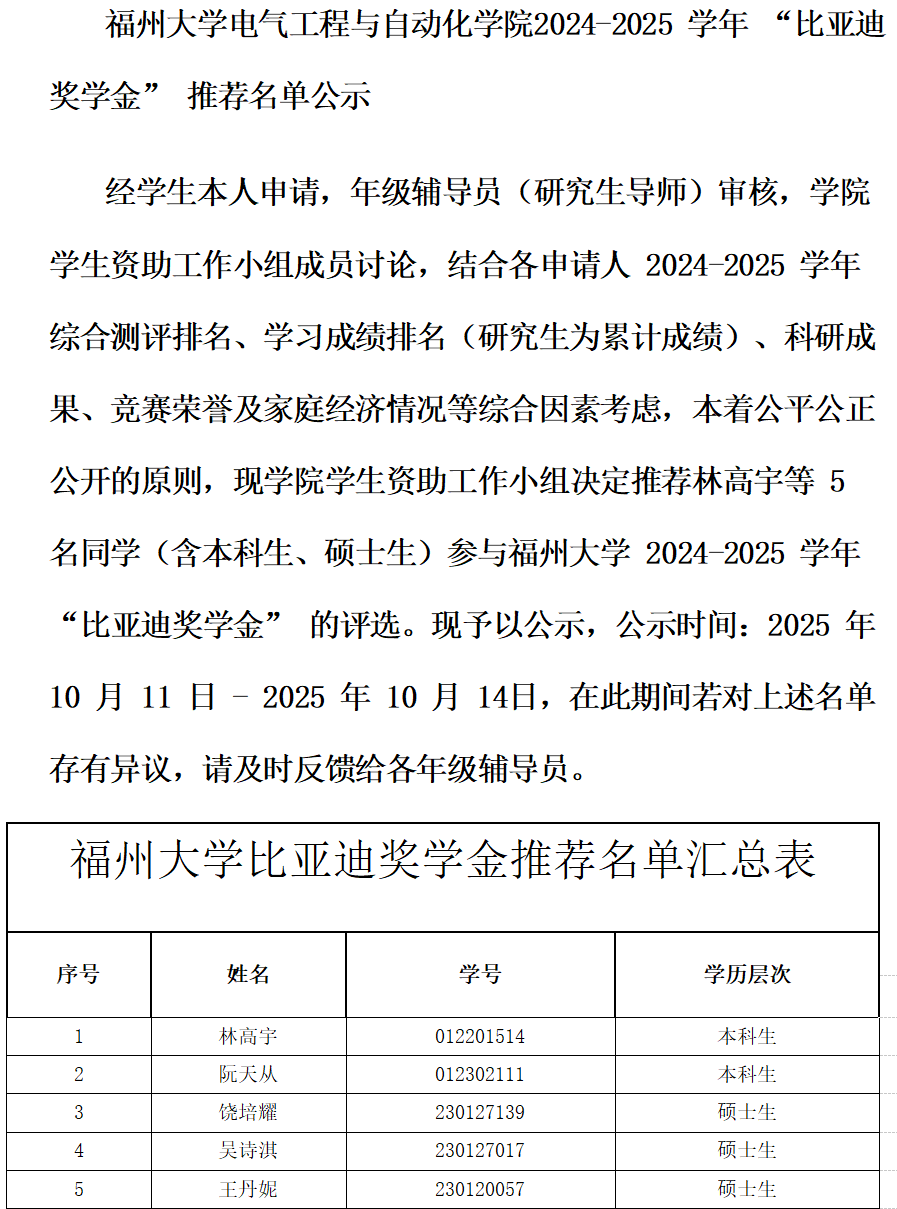 福州大学电气工程与自动化学院2024-2025 学年 “比亚迪奖学金” 推荐名单公示