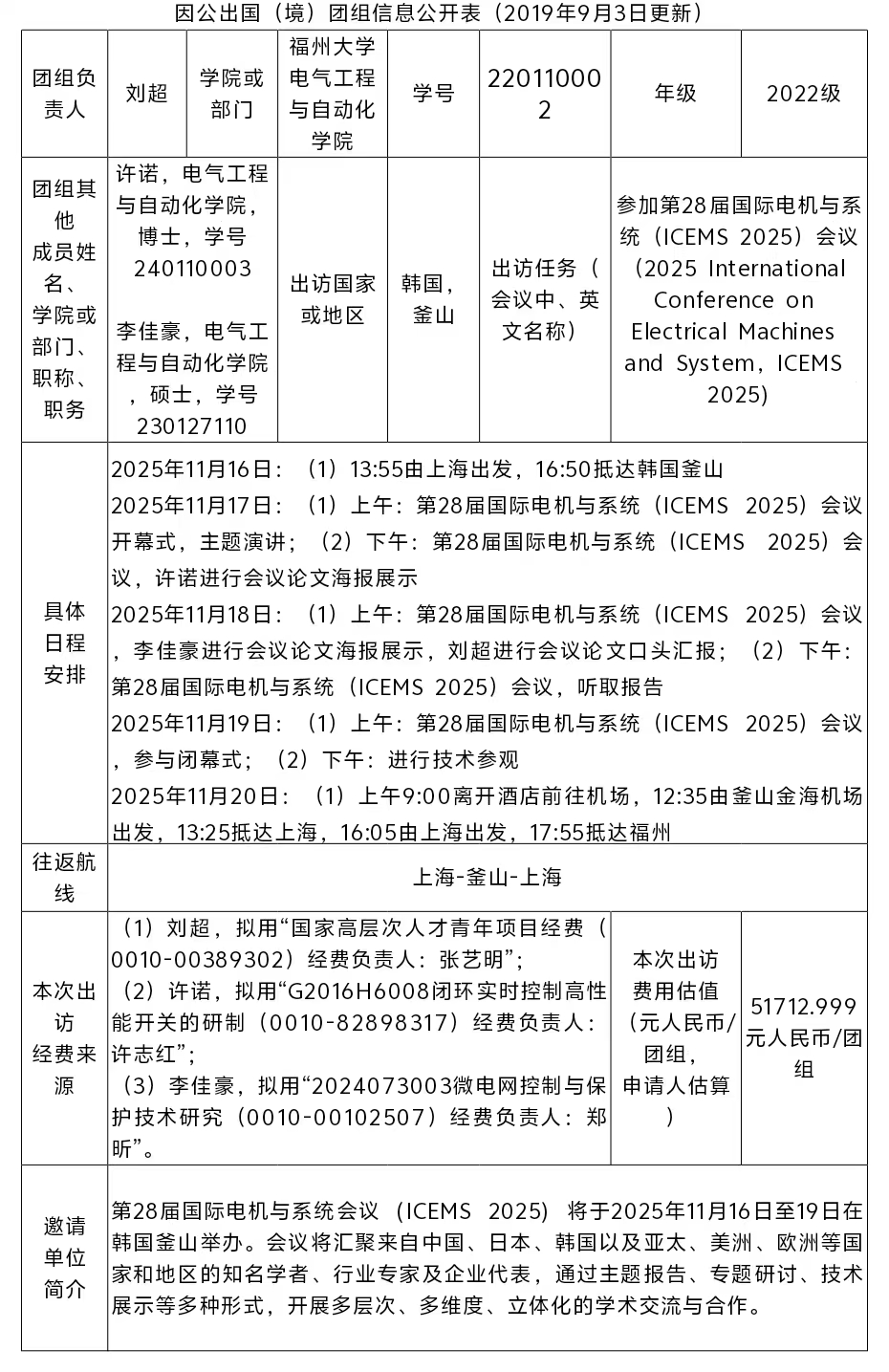 刘超,男,电气工程与自动化学院2022级电力电子与电力传动专业博士研究生,学号220110002。许诺,男,电气工程与自动化学院2024级电机与电器专业博士研究生,学号240110003。李佳豪,男,电气工程与自动化学院2023级电气工程专业硕士研究生,学号230127110。学院拟派刘超博士生、许诺博士生、李佳豪硕士生于2025年11月赴韩国釜山参加第28届国际电机与系统(ICEMS 2025)会议(2025 International Conference on Electrical Machines and System),现予以公示。公示时间从2025年10月29日起算,公示期为五个工作日。如有异议,敬请监督。联系电话:0591-22866584。