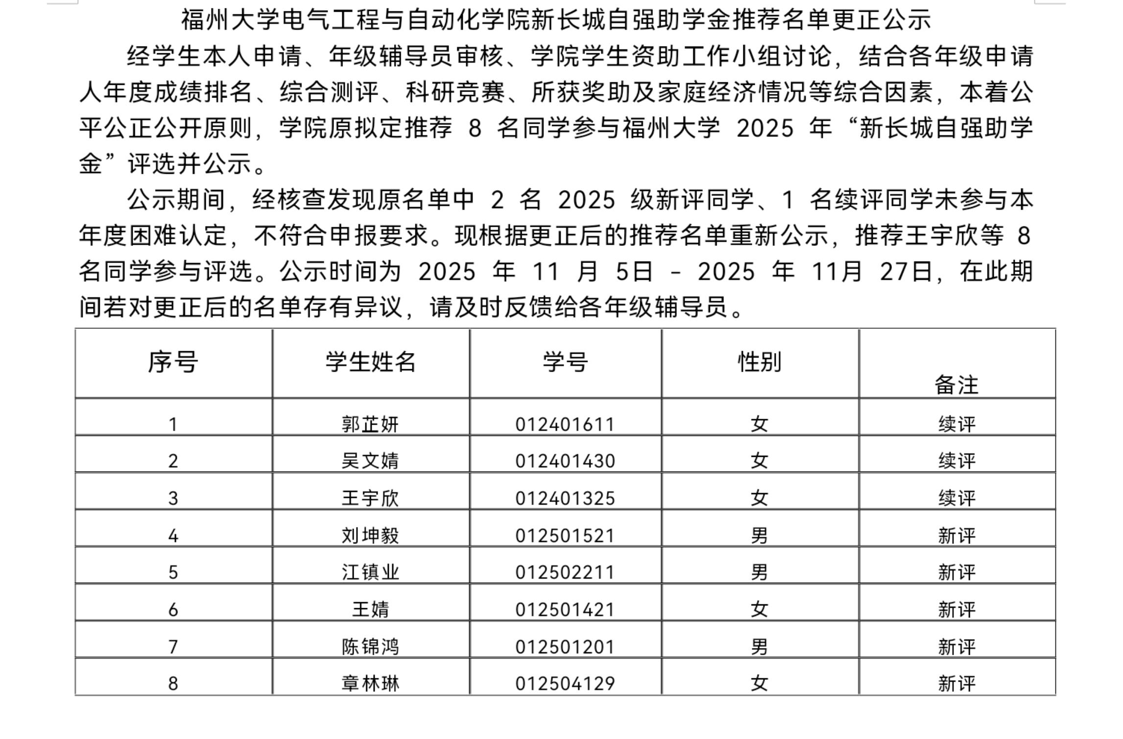 福州大学电气工程与自动化学院新长城自强助学金推荐名单更正公示