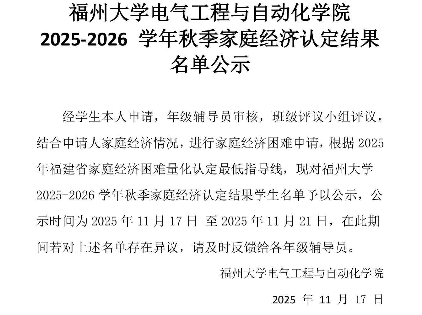 福州大学电气工程与自动化学院 2025-2026 学年秋季家庭经济认定结果 名单公示