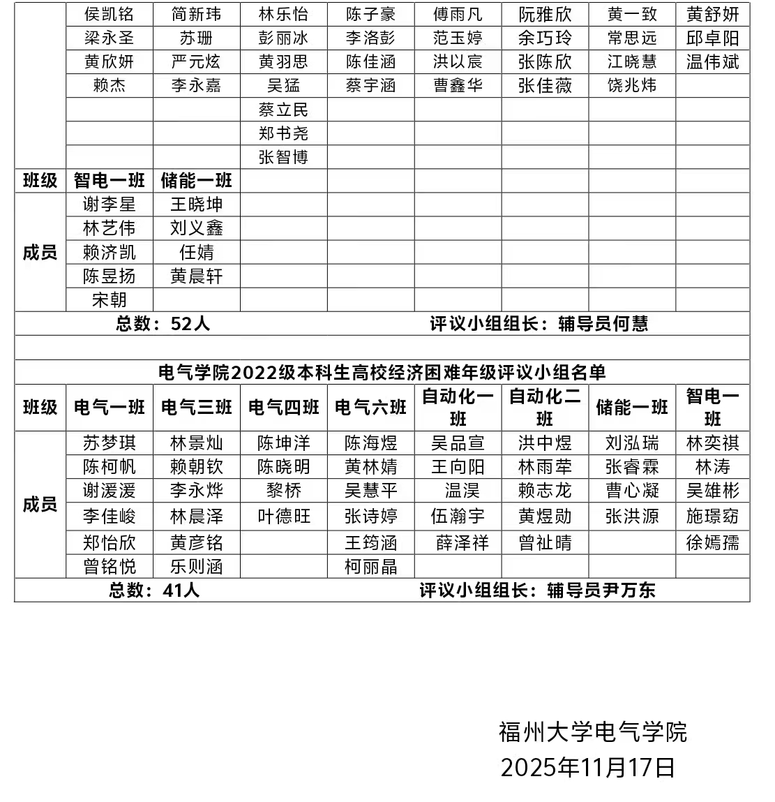 福州大学电气工程与自动化学院 2025-2026 学年秋季家庭经济认定结果 名单公示