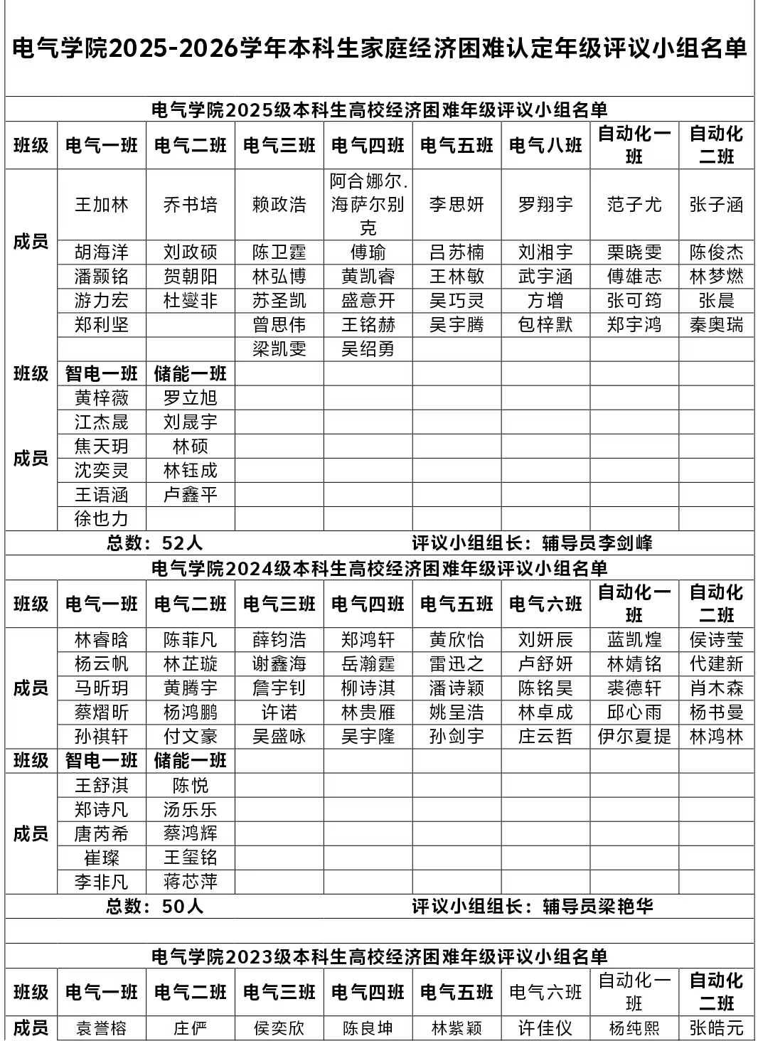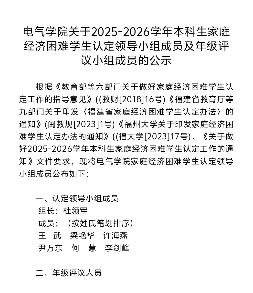 电气学院关于2025-2026学年本科生家庭经济困难学生认定领导小组成员及年级评议小组成员的公示
