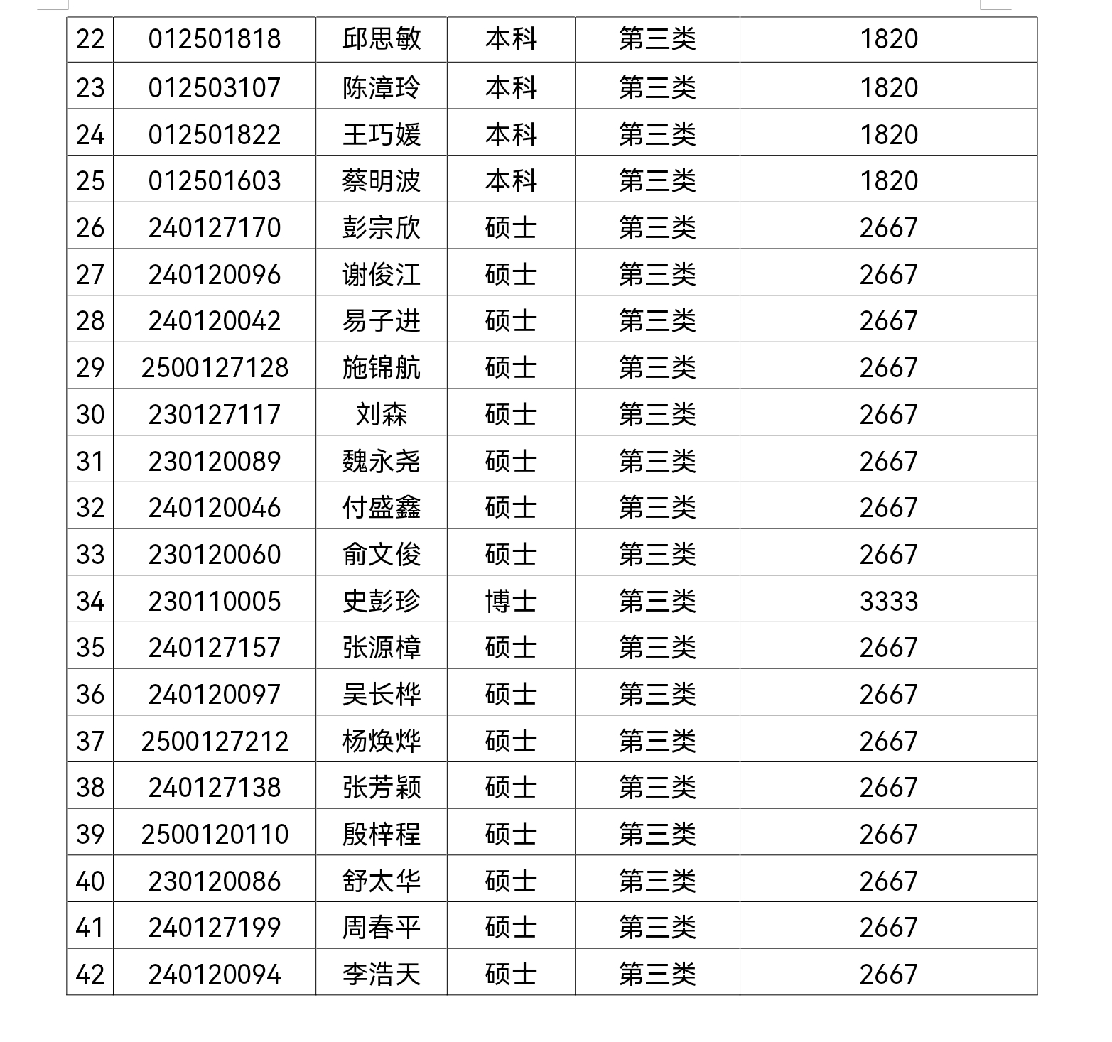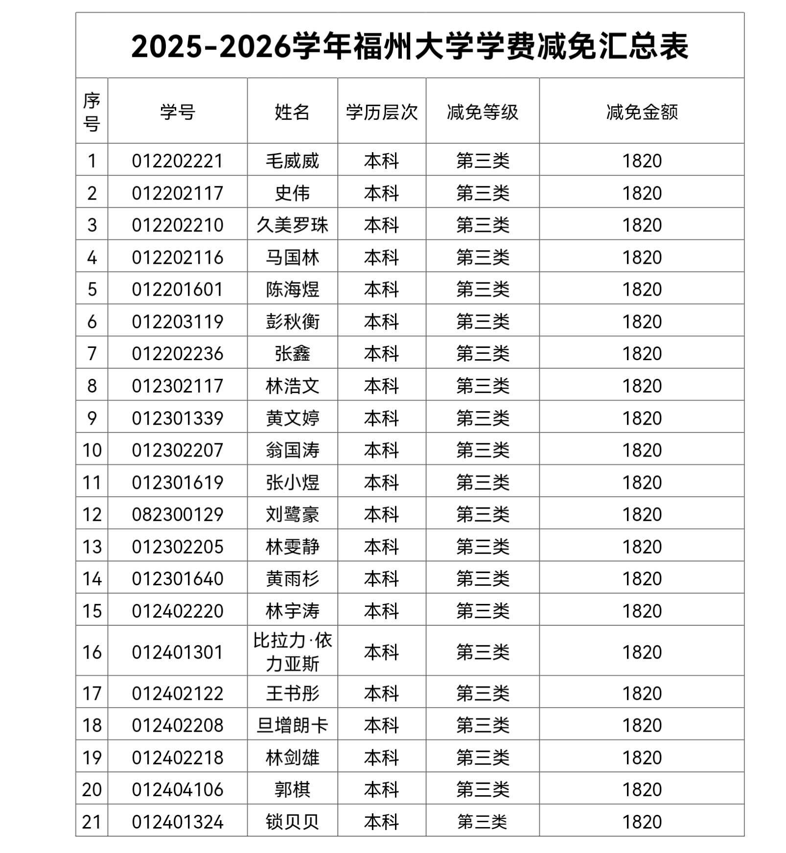 根据《福州大学学费减免实施办法》(修订)(福大学[2017]109号)文件要求,经同学申请,学院资格审核,并经学院奖助学金评审委员会评审。现学院奖助学金评审委员会拟同意毛威威等42名同学学费减免的申请。现将拟同意申请人员名单公示如下,公示时间为2025年12月30日-2026年1月4日,在此期间若对上述名单存有异议,请及时予以反馈给各年级辅导员。