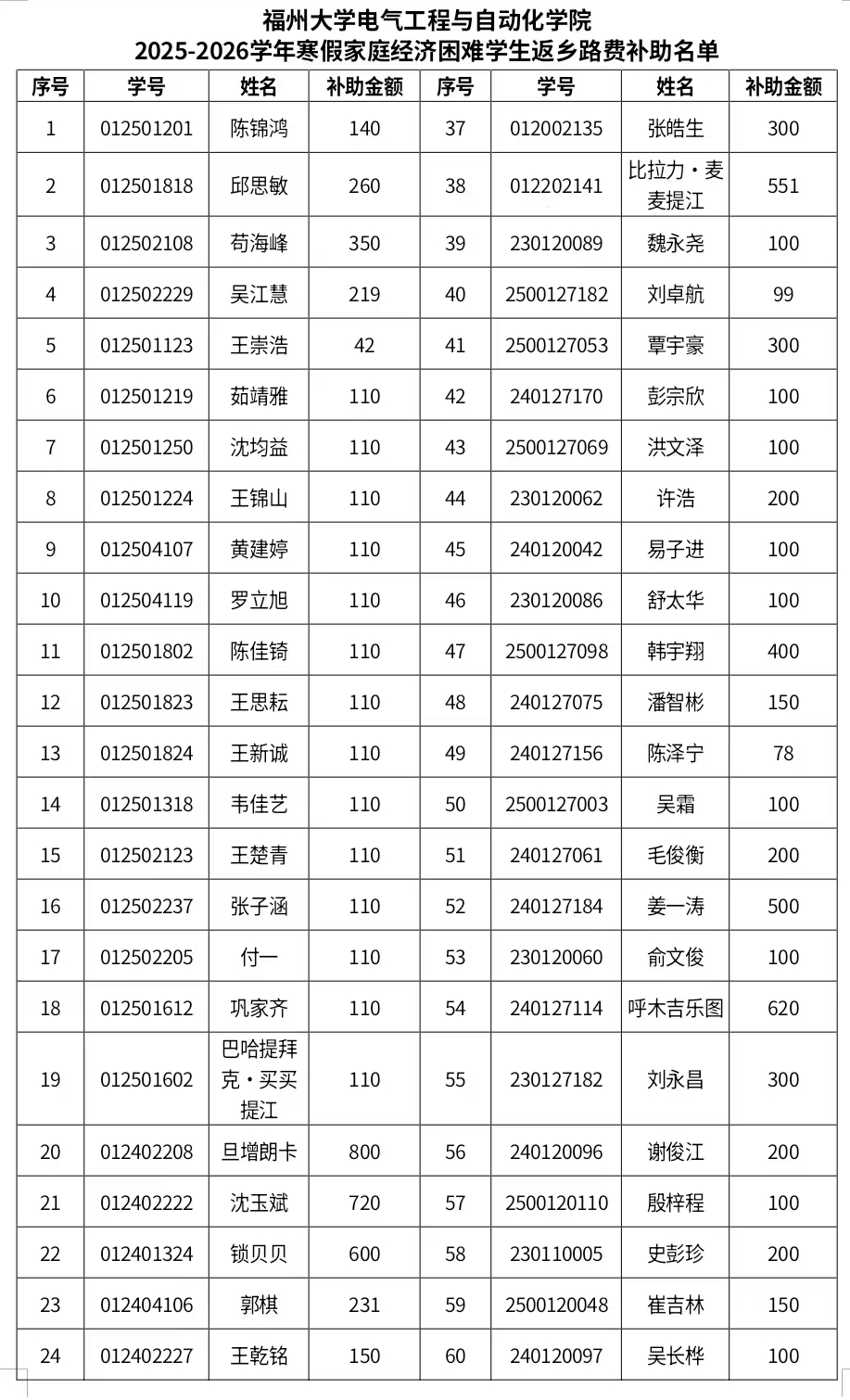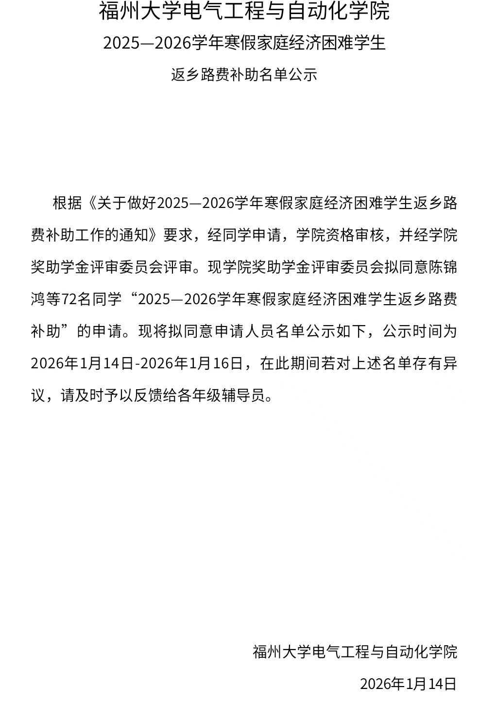 福州大学电气工程与自动化学院 2025—2026学年寒假家庭经济困难学生 返乡路费补助名单公示