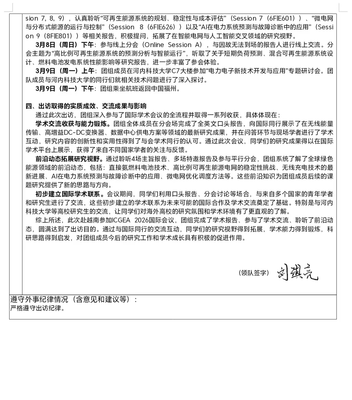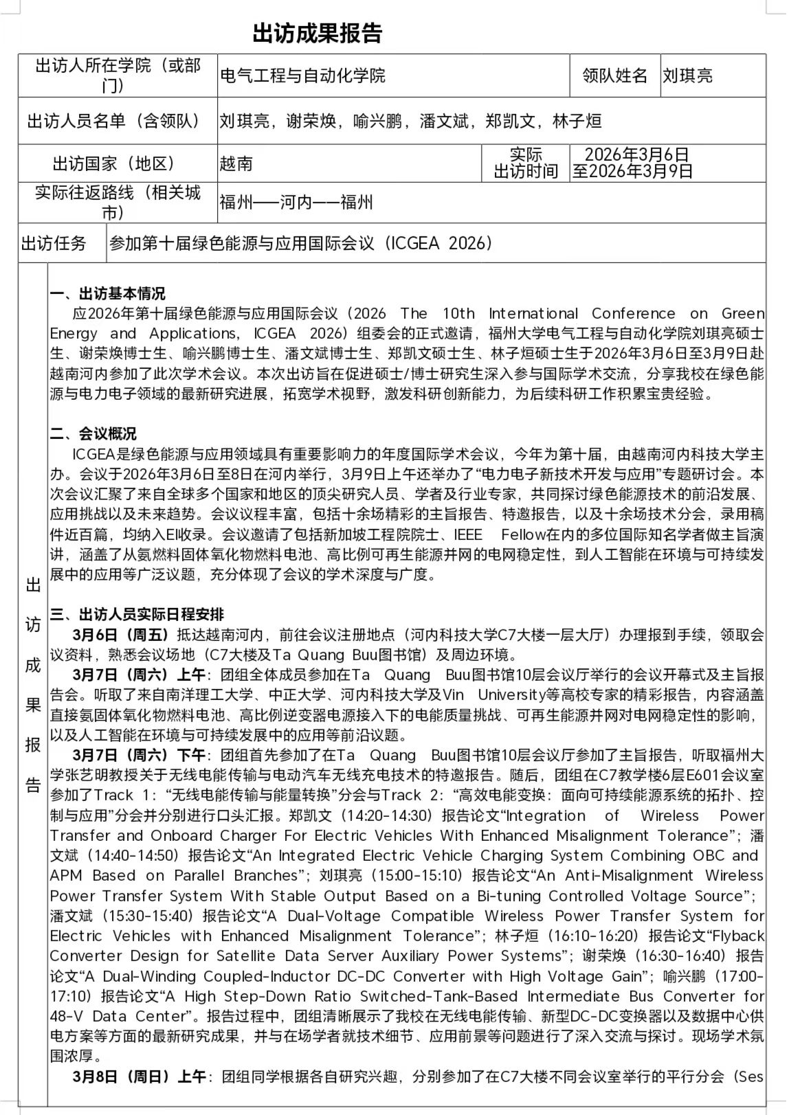 关于学院刘琪亮硕士生、谢荣焕博士生、喻兴鹏博士生等一行6人赴越南河内参加第十届绿色能源与应用国际会议出访成果报告的公示